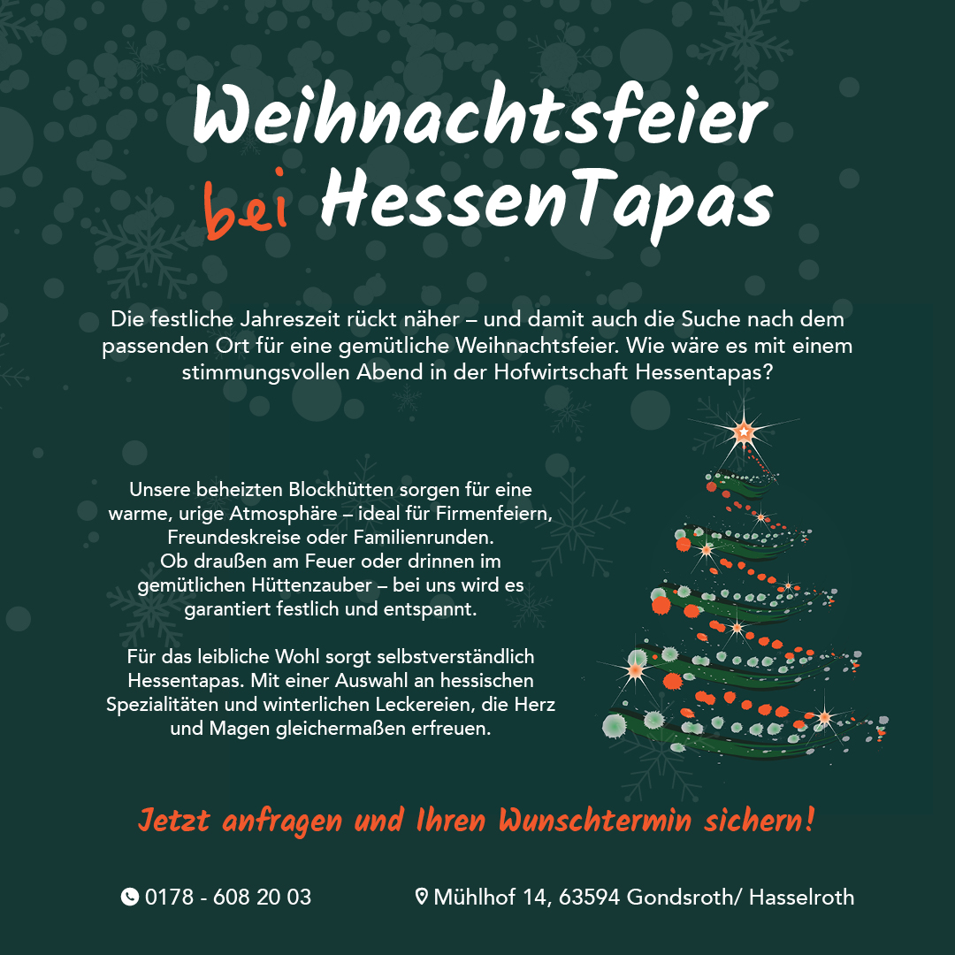 Hofwirtschaft Hessentapas Mühlhof 14, Hasselroth, DeutschlandDie festliche Jahreszeit rückt näher – und damit auch die Suche nach dem passenden Ort für eine gemütliche Weihnachtsfeier. Wie wäre es mit einem stimmungsvollen Abend in der Hofwirtschaft Hessentapas? Unsere beheizten Blockhütten sorgen für eine warme, urige Atmosphäre – ideal für Firmenfeiern, Freundeskreise oder Familienrunden. Ob draußen am Feuer oder drinnen im gemütlichen Hüttenzauber – […]